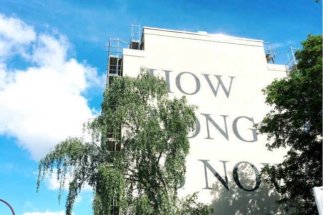 HOW LONG IS NOW, das Werk der Künstlergruppe Globalodromia aus dem FILOART Movement, das 1997 entstand und im gleichen Jahr bei der Tacheles-Werkschau gezeigt wurde, prangte seit 2006 als haushohes Gemälde an der Ostfassade des Tacheles. Nun haben Bauarbeiten auf dem Nachbargrundstück das Wahrzeichen aus Mitte verdrängt. Aber es verschwindet nicht. Denn die WBM Wohnungsbaugesellschaft Berlin-Mitte gewährt dem Wandbild Asyl in Friedrichshain.