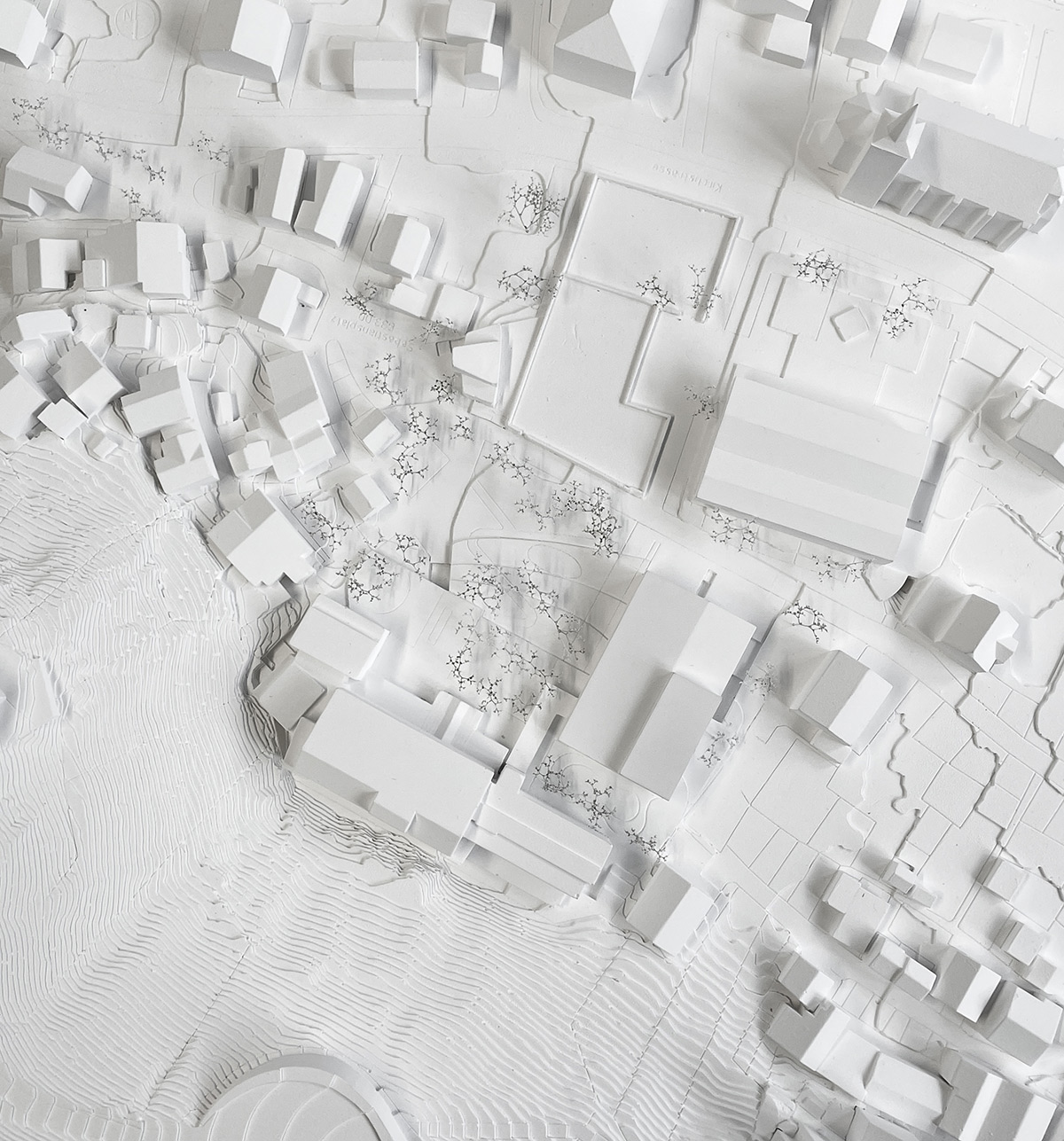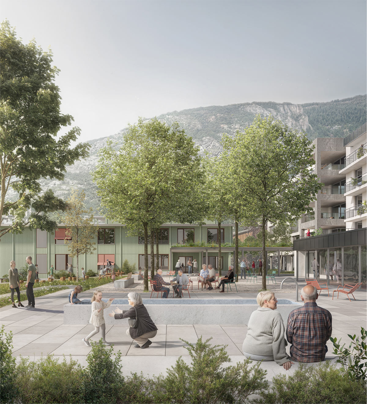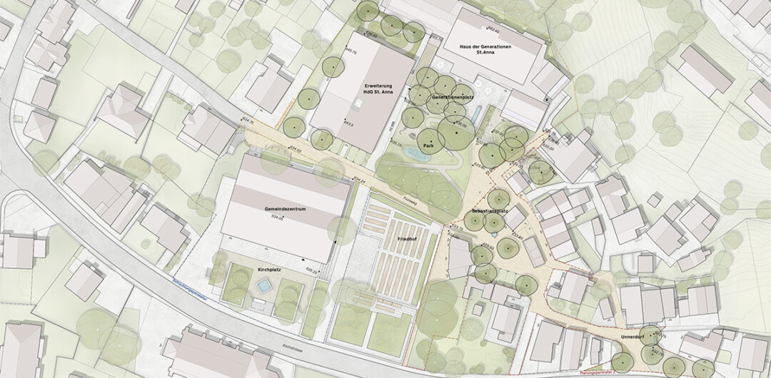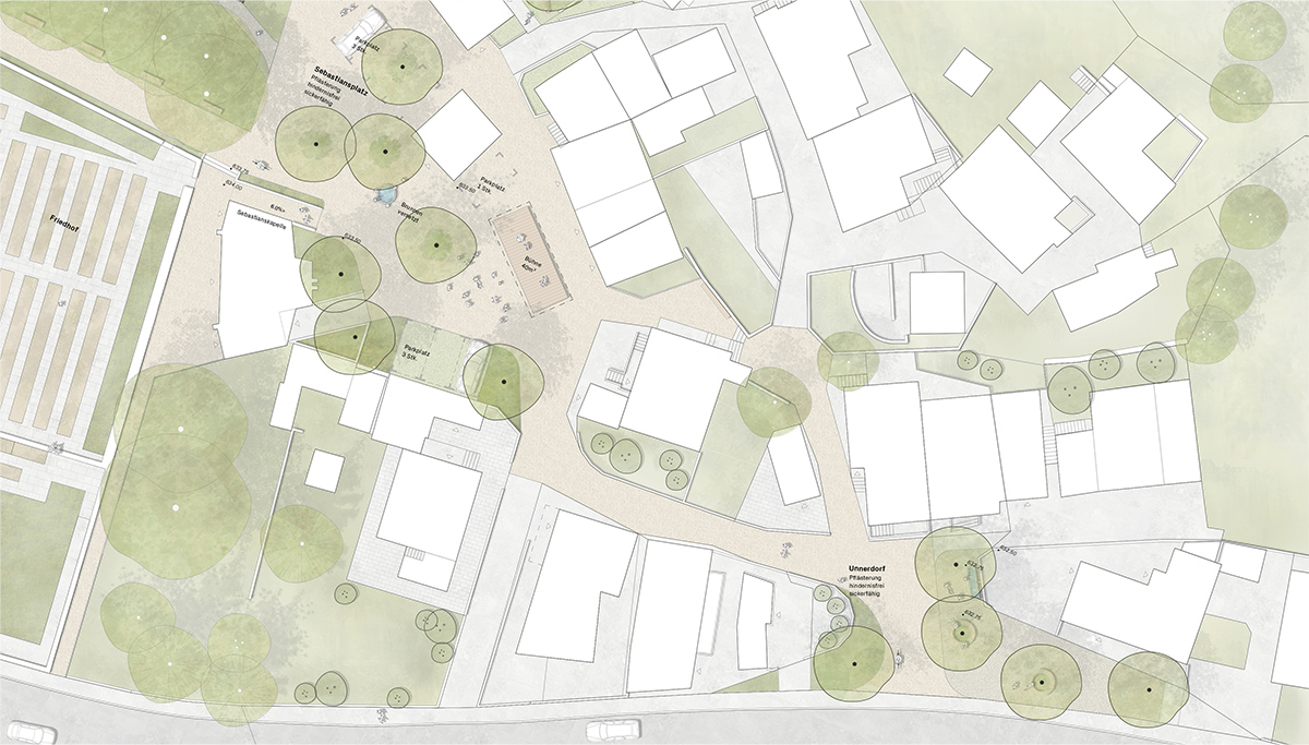 Der vorgeschlagenen Erweiterungsbau verortet sich entlang der westlichen Parzellengrenze als eigenständiger Baukörper. Zwischen Neubau und Bestand entsteht ein Freiraum, der als Demenzgarten genutzt wird. Der Aussenbereich an der Ostseite wird gesamthaft als Park und Dorfplatz neugestaltet. Die KITA erhält einen direkt angrenzenden Aussenraum und einen naturnahen Spielplatz. Die Neugestaltung und Aufwertung der verschiedenen Perimeter bietet die Möglichkeit, bislang getrennte Bereiche miteinander in Beziehung zu setzen und als einheitliches Ganzes zu formen.