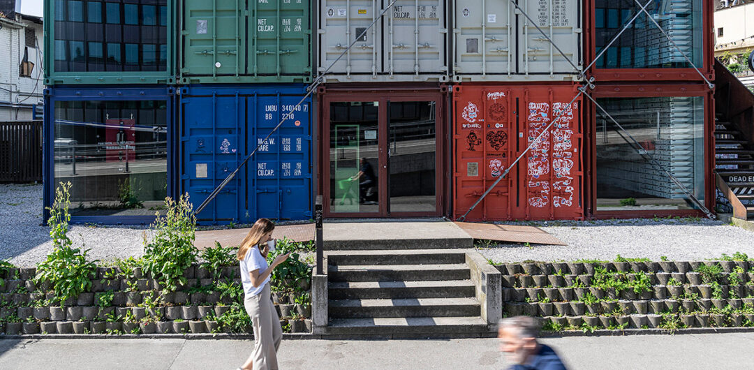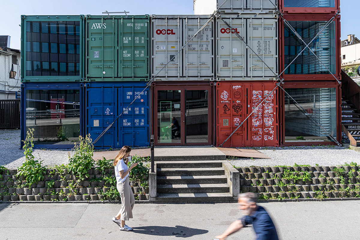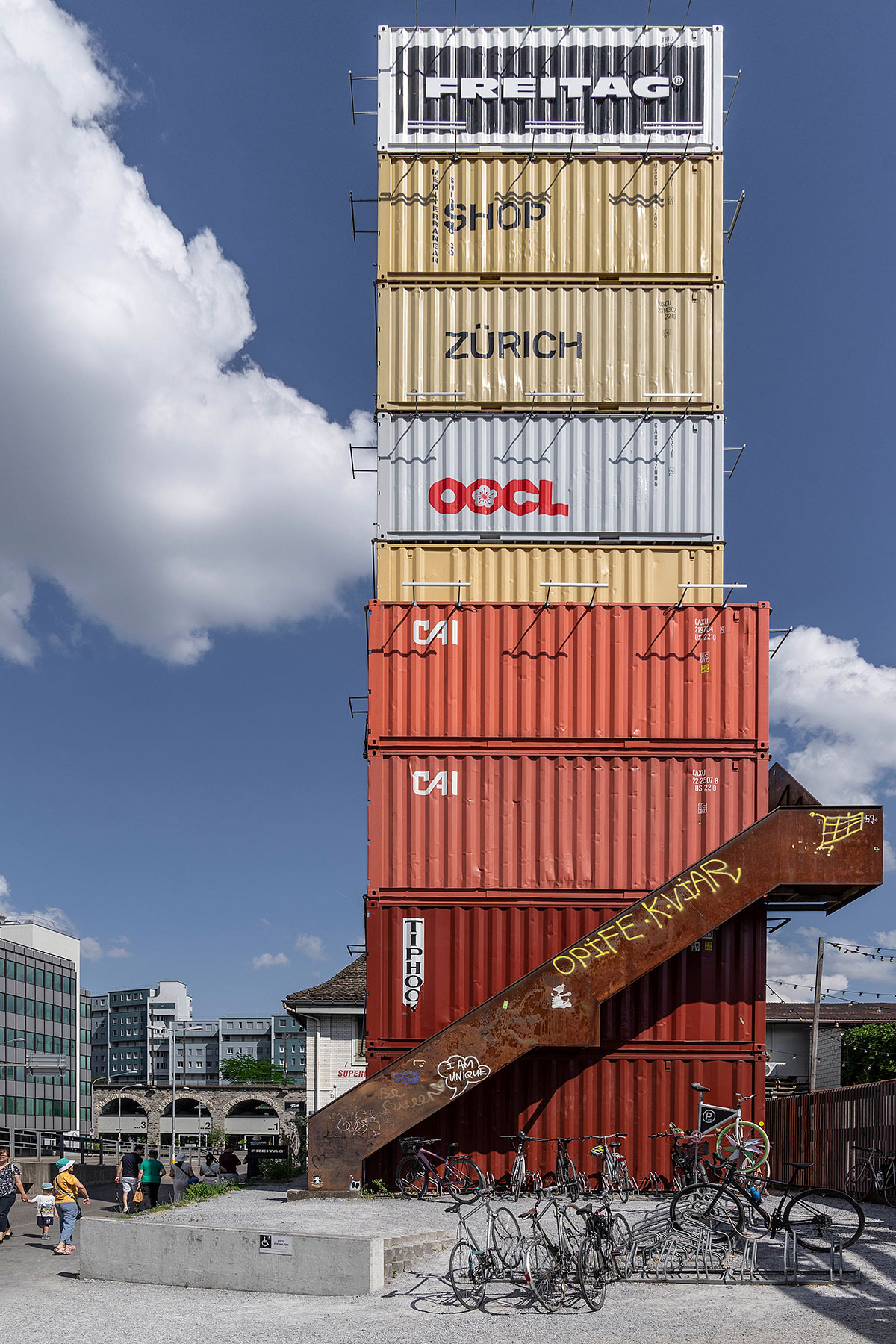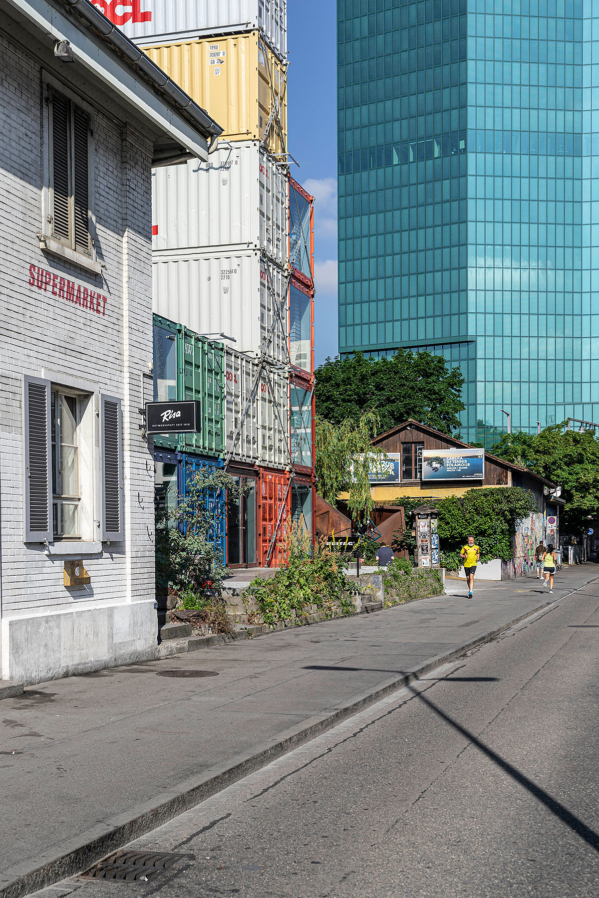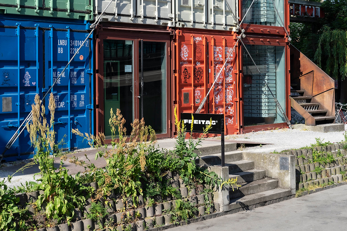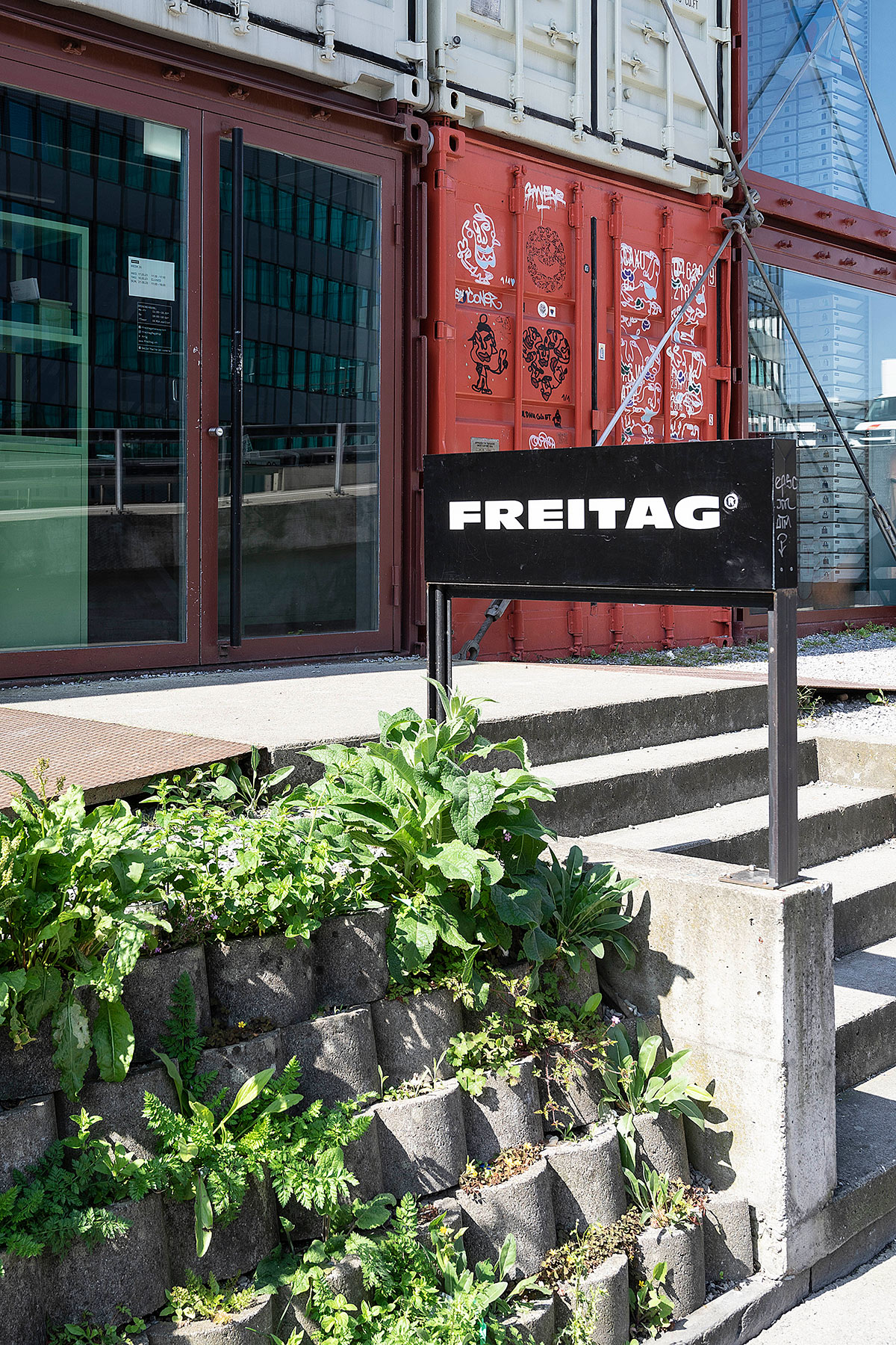 Freitag als ‚international brand’ im Bereich Lifestyle und Design hat sich das Recycling von Materialien zum Markenzeichen gemacht. Dabei entstehen unter Verwendung gleicher Gestaltprinzipien individuelle Produkte. Dasselbe Prinzip macht sich die Freiraumgestaltung zu Nutze. Hartgesteinsplitt, Fertigteile aus Beton, Porenbeton und Stahl, sind einfache, gängige Materialien aus recycelten Grundstoffen. Materialien, die sich in die Umgebung des Industriegebietes wie selbstverständlich integrieren und häufig anzutreffen sind.