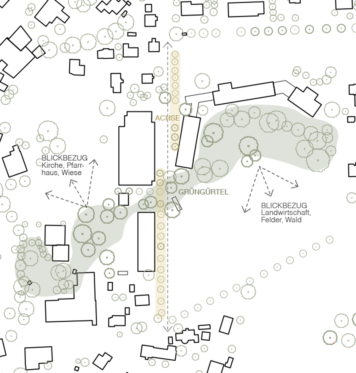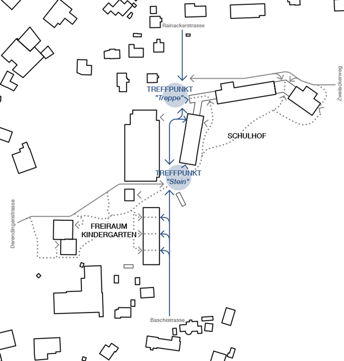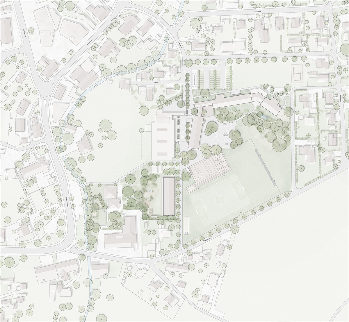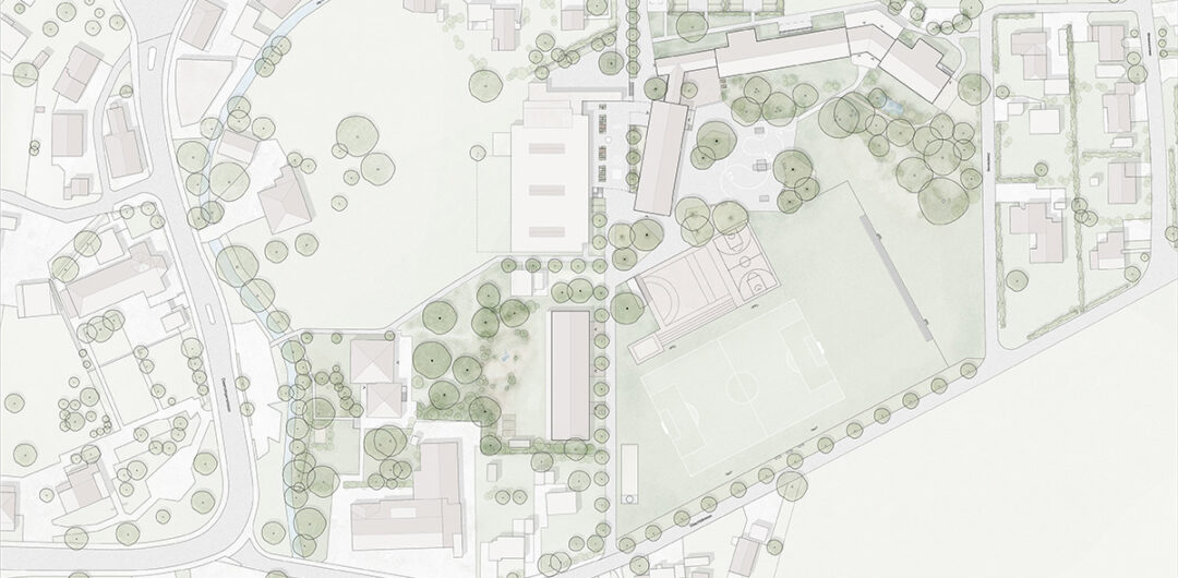 Das Freiraumkonzept wird von zwei prägenden Hauptelementen getragen: Dem durchgehenden und verbindenden Wald-/Grünelement und den markanten Baumreihen. Diese werden zusätzlich durch Neupflanzungen komplettiert, um die bestehenden Achsen zu stärken. Der Grüngürtel fasst das gesamte Areal, vernetzt die bestehenden Qualitäten der naturnahen Vegetation im Nordosten und beim „Baschi“ und entwickelt sie zu einem durchgehenden, verbindenden Element mit hoher Aufenthalts- und Naturraumqualität weiter. Gezielte Eingriffe – etwa punktuelle Bepflanzungen auf den Plätzen – werten den Freiraum auf, stärken das Mikroklima durch Verschattung und Verdunstung und leisten einen Beitrag zur Versickerung und zum Wärmeschutz. Als zweite Massnahme wird die Nord-Süd-Achse durch eine Baumreihe akzentuiert, welche die öffentliche Durchwegung klar ablesbar macht. Sie verbindet die Hauptzugänge, begleitet die Wegführung und wird im Atrium vor der ‘alten Turnhalle’ fortgeführt. So entsteht eine grüne Sequenz, die nicht nur Orientierung bietet, sondern auch die Aufenthaltsqualität im Bereich zwischen Zweienhalle und der Tagesschule mit der Bibliothek wesentlich steigert. Im Norden und Süden entstehen markante Ankunftsorte: die Treppe und der Stein. Sie fungieren als Treffpunkte und Verteilerzonen auf dem Areal. Mit gezielten, kleinen Eingriffen im Freiraum erhalten diese Orte eine klare Adressbildung. Der Kindergarten erweitert das Ensemble im Südwesten und wird an die Nord-Süd-Achse angebunden. Dadurch entstehen klar zonierte Aussenräume mit Bezug zum „Baschi“, die das Grünraum- Potenzial maximal ausschöpfen und das städtebauliche Prinzip der aufgereihten Baukörper fortführen. Die Grünelemente strukturieren den Raum, nehmen bereits identitätsstiftende, prägende Merkmale des Areals auf und entwickeln sie weiter. Dazwischen entstehen Grünflächen mit unterschiedlichen Nutzungen für diverse Altersstufen.