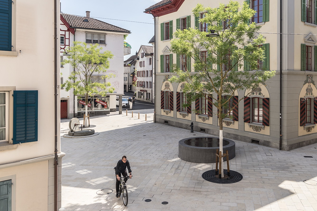 Der alte, schutzwürdige Dorfkern Lachens mit seinen Gassen, Plätzen und Strassenzügen wurde durch eine Umfahrungsstrasse vom Verkehr entlastet. Sowohl der Dorfkern als auch die Zufahrtstrassen zum Dorfkern sind Teil des bearbeiteten Perimeters. Der Dorfkern soll für die Besucher und Nutzer wieder stärker ablesbar und erlebbar werden. Eine durch Gassen verbundene Trilogie von Plätzen prägt den neuen Dorfkern Lachens. Der gesamte Freiraum zwischen den drei Plätzen Kirchplatz, Rathausplatz und Kreuzplatz wurde aufgewertet und ist nun für Bewohner und Besucher ein nutzbarer, qualitätsvoller Aufenthaltsraum und Begegnungsort. Die Neuinterpretation des Freiraums, mit einem umfassenden neuen Verkehrskonzept, einheitlicher Signaletik und passender Möblierung greifen ineinander und schaffen einen Stadtraum, der die wertvollen bestehenden Orte und Gebäude miteinander in Einklang bringt.