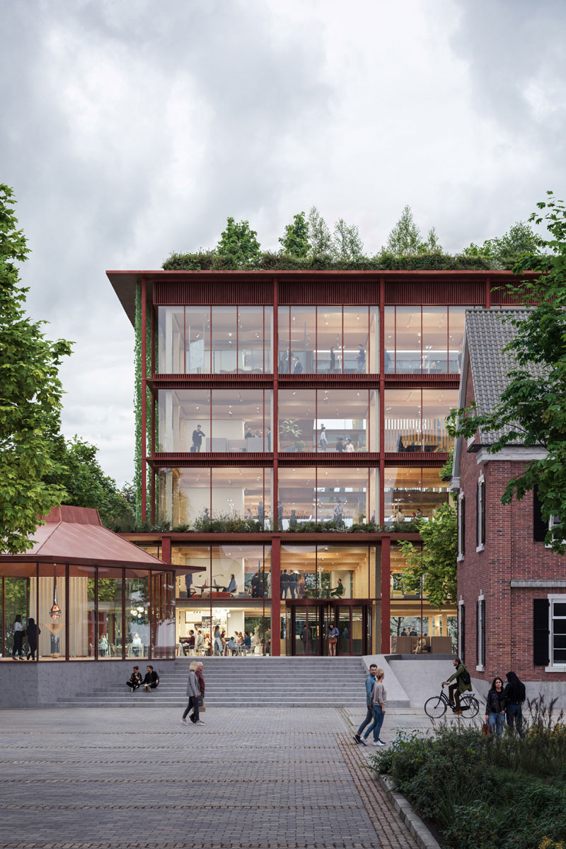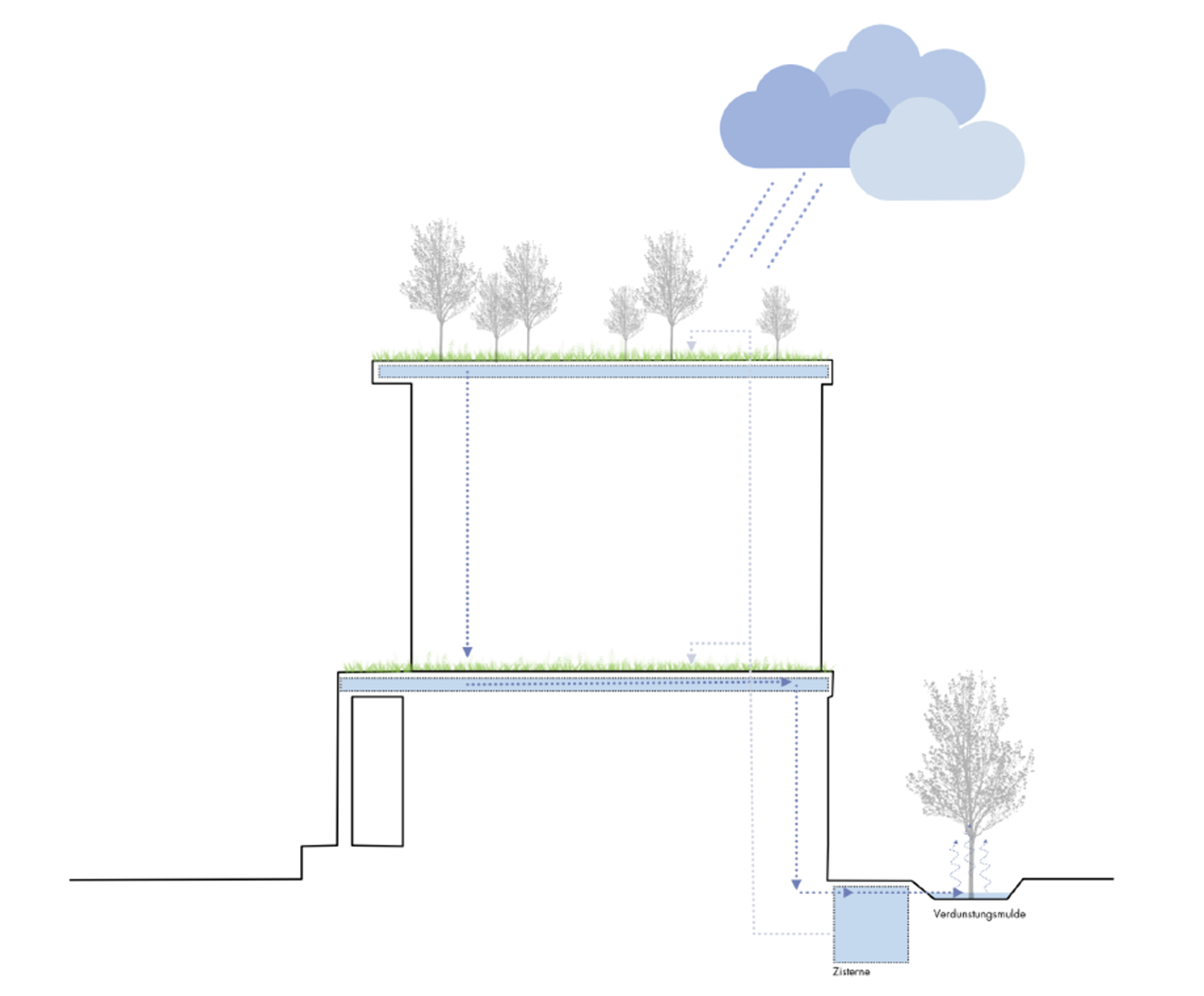 Zur Förderung von Mikroklima und Biodiversität sowie im Sinne der angestrebten DGNB-Platin-Zertifizierung werden die Dachflächen intensiv begrünt, mit Stauden, Gräsern und kleinen Bäumen in Pflanztrögen.