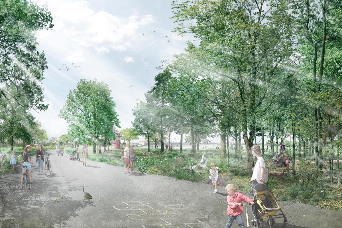 Die Entwicklung erfolgt nicht durch Bebauung, sondern durch eine gezielte landschaftliche Setzung: eine ökologische Waldmembran mit vielfältiger Ausprägung, die sich zwischen dem ehemaligen Taxiway und dem Rand des Feldes entfaltet. Ergänzt wird diese durch ein innovatives Modell zur Beteiligung der Stadtgesellschaft.