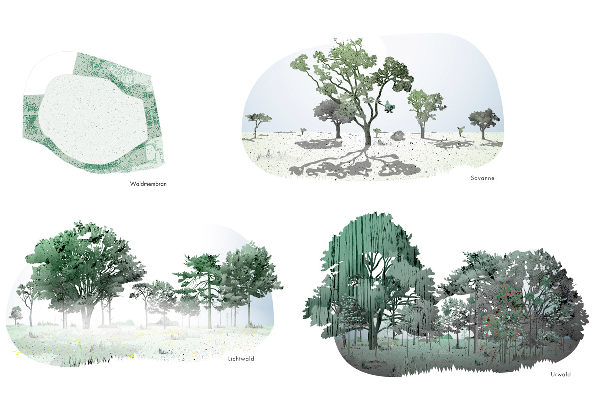 Die bisher fragmentarische Randzone wird zu einer durchgehenden, landschaftlich gestalteten Waldmembran unterschiedlicher Landschaftstypen weiterentwickelt. Einem Klima- und Nutzungsraum, der Stadt und Feld miteinander verbindet. Etwa 2.500 klimaresiliente Bäume, davon 1.300 Solitärbäume werden so gepflanzt, dass eine gestufte, vielfältige Vegetationsstruktur entsteht. Drei Landschaftstypen, die Savanne, der Lichtwald und der Urwald, wechseln sich sequenziert innerhalb des äußeren Parkrings ab. Diese Zonierung erzeugt neue Räume mit jeweils spezifischem Charakter, Atmosphäre, Aufenthaltsqualität und ökologischem Wert.