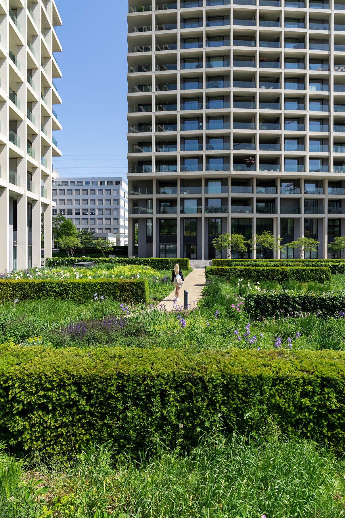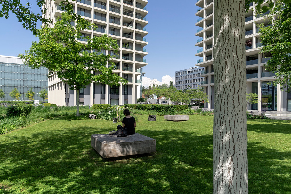Parkierungs- und Erschliessungsstreifen werden im Westen angelegt, während im Osten ein Verbindungsweg für eine klare Trennung zu den Nachbargrundstücken sorgt.Dieser Verbindungsweg stellt eine öffentliche Verbindung vom Opfikerpark zum Leutschenpark sicher, zwei wesentlichen Bestandteilen des städtischen Freiraumsystems. Die Türme East und West werden über einen zentralen Platz miteinander verbunden. Zwei Wasserbecken im Osten und ein grosses im Westen begrenzen den Platz. Sie sind als unbewegte Wasserspiegel konzipiert und werden als Mulde im Belag erstellt. Zierkirschen werden den Wasserbecken zugeordnet. Unter dem Baumdach sowie am Quartierplatz laden Sitzhocker zum Verweilen ein. Die Grünflächen werden von einem üppigen Staudenteppich dominiert. Die kreisförmig sortierten Stauden bieten das ganze Jahr über unterschiedliche saisonale Aspekte und bilden ein Pendent zu den Wasserbecken.