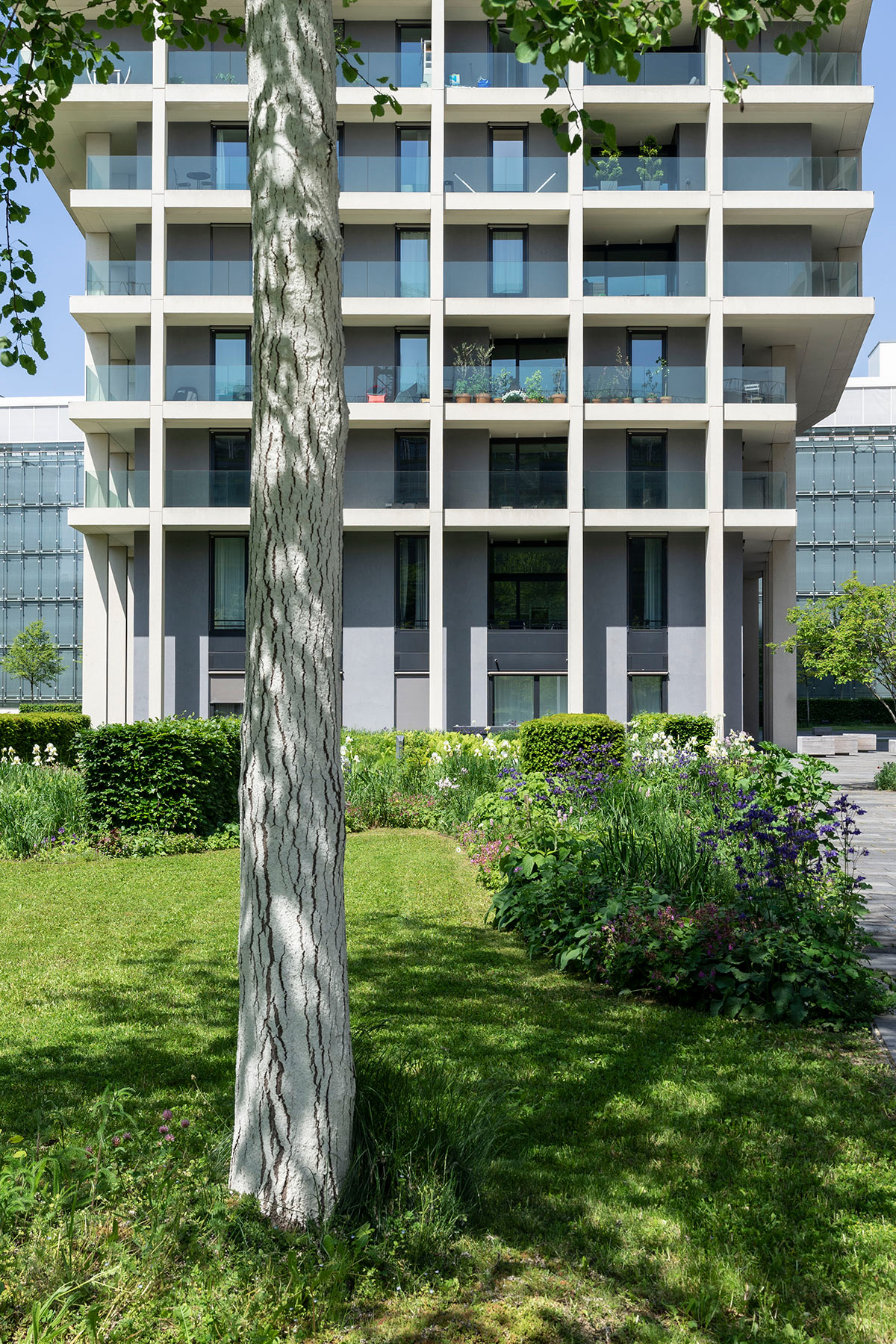 Die Anlage ist als repräsentative Adresse für gehobenen Wohnstandard konzipiert.Entsprechend wird das Umfeld durch eine intensiv mit Stauden und Gehölzen gestaltete Grünfläche sowie durch einen adressbildenden Platzbereich geprägt und zoniert. Das Areal wird im Westen über einen städtischen Platz zugänglich gemacht. Der Platz wird durch ein hochgeschnittenes einladendes Baumdach aus Grossbäumen (Sophora japonica) definiert die in einem leicht aufgespreizten Raster stehen.